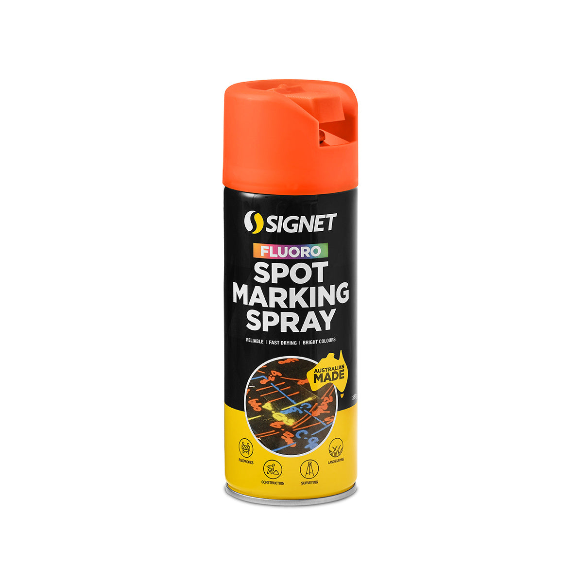 our highest standard. Spot Marking Sprays are an ideal way to mark a variety of surfaces for applications in the construction, civil, landscaping, plumbing and general work areas to name a few. The solvent based formula allows for easy cleaning with Signet’s Acetone, Graffiti Remover or Methylated Spirits.